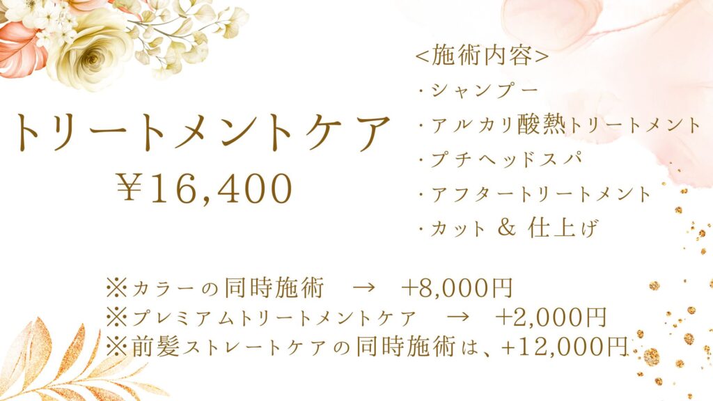 しかし、これから髪を傷ませないようにしていけば予防ができます。エイジングのダメージや紫外線、などが原因で悩んでいる方は、トリートメントケアを強くおすすめします。
